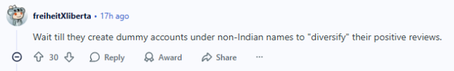 还有一位网友提醒说:“等着瞧吧,他们接下来可能会用非印度名字注册虚假账号,来‘多样化’他们的好评。”