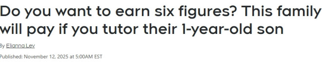 一户来自的富裕家庭,正以六位数年薪招聘一位家教,任务是教他们的儿子如何成为一位“英式绅士”。唯一的“反转”?,这个学生才1岁。