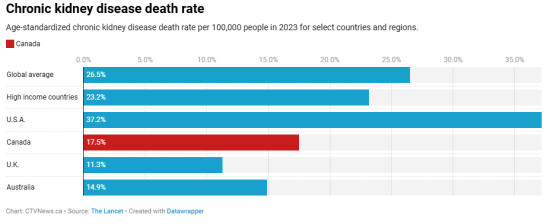 一項涵蓋204個國家的最新醫學研究指出,加拿大患腎病率雖然輕微下跌,但死亡率卻反升超過七成。