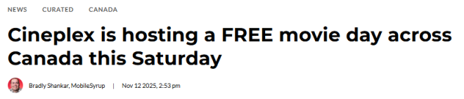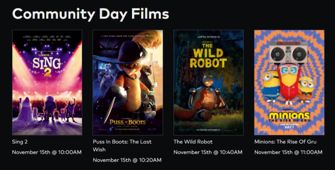 加拿大Cineplex影城的年度社区日(Community Day)将在11月15日星期六举行,全国范围内提供各种免费和游戏。