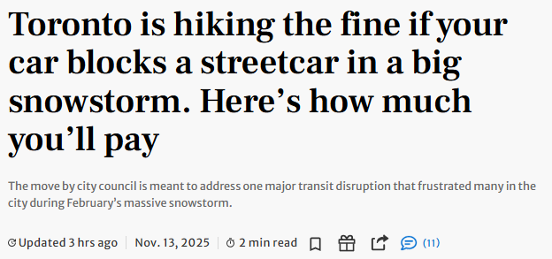 多伦多市议会将对在大雪期间停放或空转挡住TTC电车轨道的车辆罚款提高了一倍以上。