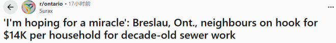 安省布雷斯劳(Breslau)社区的居民最近震惊不已,因为他们在本月初突然收到政府寄来的一封信,向每户家庭追缴近1.4万加元,用于支付10年前铺设自来水和下水道工程的费用。