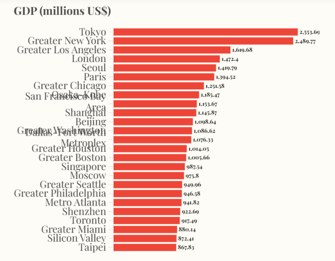 東京位居全球榜首,GDP為25.5369億美元。大紐約、大洛杉磯位列前三,中國的上海擠進前十名。