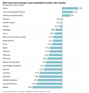 儘管宮頸癌令人擔憂,但報告也指出值得樂觀的趨勢:肺癌死亡率每年下降約 3%,結直腸癌死亡率持續下降(得益於糞便篩查和結腸鏡),膀胱癌死亡率下降(與吸煙人數減少有關)。