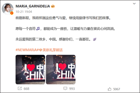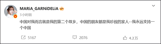 11月18日,日本歌手美依禮芽在微博發文稱:“中國對我而言就是我的第二個故鄉,中國的朋友都是我珍視的家人,我永遠支持一個中國。”
