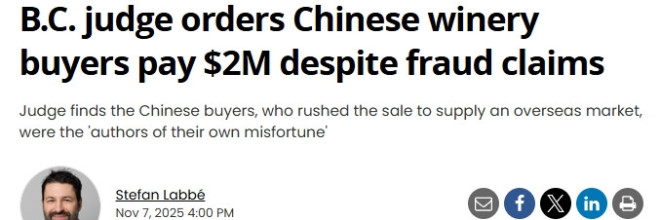 一宗持续了8年,围绕加拿大卑诗省一家酒庄交易的诉讼案终于落幕。尽管中国买家指控前业主欺诈、并称酒庄库存“无法销售”,但法院最终仍判令买家向卖家支付逾200万加元。