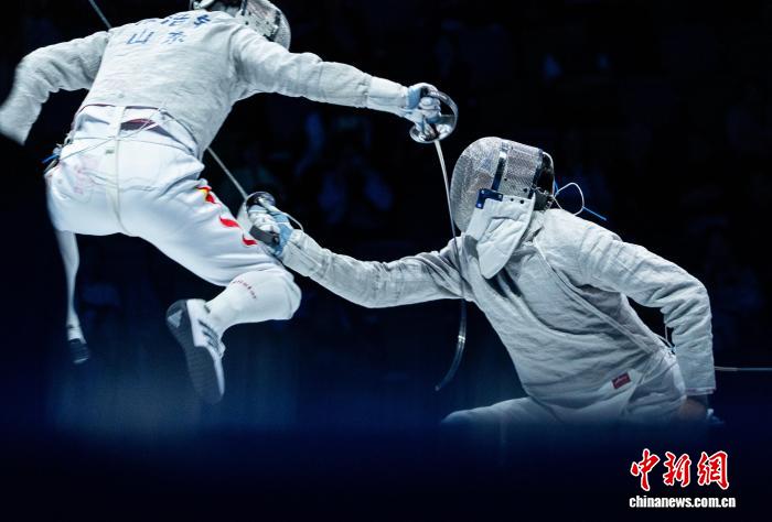 11月18日,第十五届全国运动会击剑项目男子佩剑团体赛决赛在香港启德体艺馆举行,山东队以45:43战胜广东队夺得冠军。图为山东队选手徐浩钧(左)和广东队选手许英明比拼。 记者 侯宇 摄