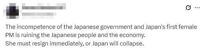 对此,有网友发文表示,“日本政府的无能和日本首位女性首相,正在毁掉日本人民和经济。 她必须立即辞职,否则日本将崩溃。”