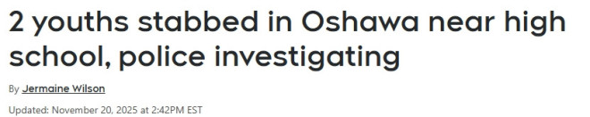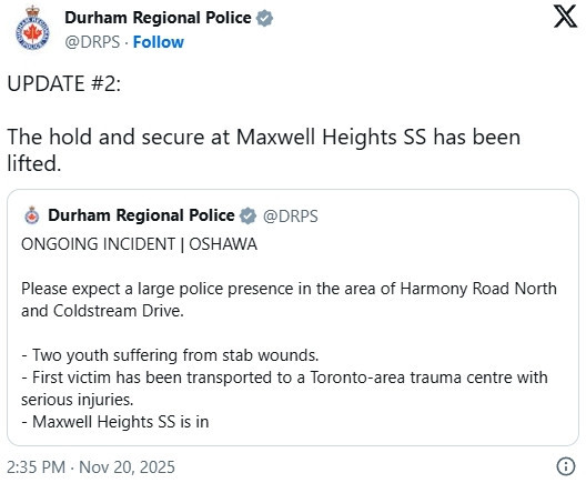 周四下午,大多伦多杜兰区(Durham)警方向居民发出提醒,要求避开奥沙瓦北部一带区域。此前,两名青少年在当地遭到刺伤,附近一所学校因此一度被置于“封锁保护”(hold-and-secure)状态。