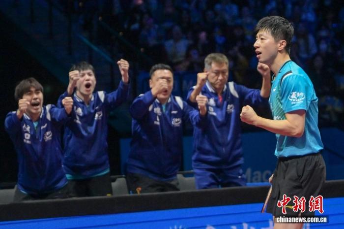 11月20日,十五运会乒乓球成年组男子团体金牌赛在澳门银河综艺馆举行。图为马龙(右一)在比赛中。记者 陈永诺 摄
