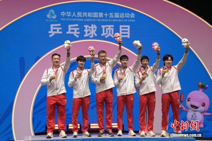 11月20日,十五运会乒乓球成年组男子团体金牌赛在澳门银河综艺馆举行。北京队选手王楚钦(右一)、马龙(右二)、黄友政(右三)等在领奖台上合影。记者 陈永诺 摄
