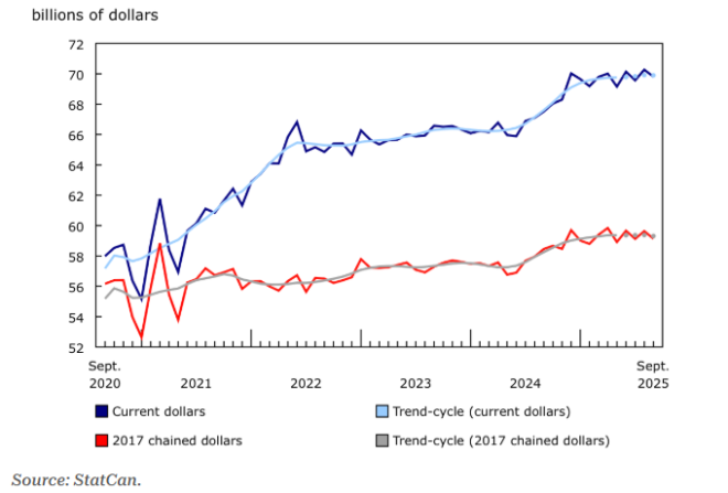 9月加拿大零售额下降0.7%,至698亿加元,按当期加元计算属于小幅回落。第三季度的整体活动相对稳定,使得这一下跌的冲击有所缓和,但销售量仍下降0.3%。这确实显示经济在放缓,但未达到一些决策者所担心的市场崩塌式下降。
