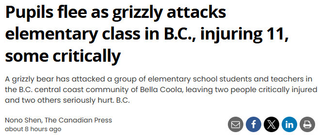 加拿大BC省中部海岸贝拉库拉(Bella Coola)近日发生发生惊险一幕:一只灰熊袭击学生和老师,造成11人受伤。其中4人伤势严重,另有7人在现场接受了治疗,但无需送往医院。