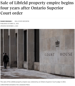 另外,據加拿大環球郵報月初的報道,多倫多利布菲爾德家族價值數十億元的房地產帝國出售案在法官最初下令出售四年多後終於啟動,這標誌着四兄弟之間曠日持久的激烈爭奪進入了最後階段,這四兄弟繼承了父親留下的龐大資產。