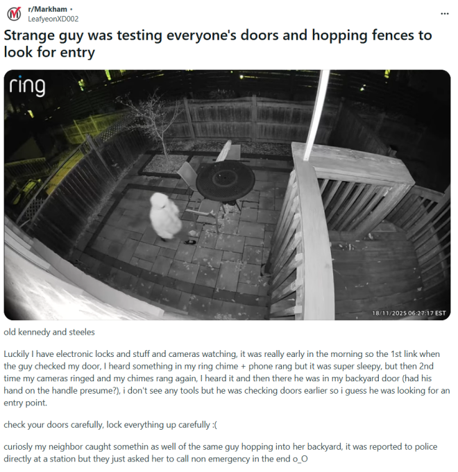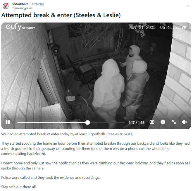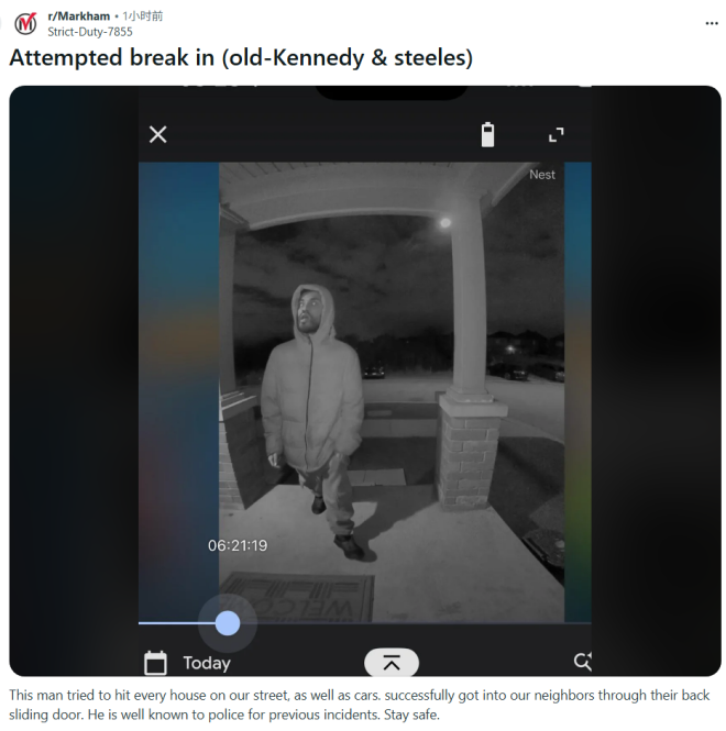 近日,多户住在Steeles的屋主在Reddit论坛的r/Markham万锦社区板块中公布自家监控画面,显示他们接连遭遇入室盗窃未遂事件。