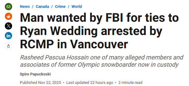 一名因涉嫌与前加拿大奥运选手Ryan Wedding有关联而被美国当局通缉的加拿大男子,已经被逮捕。Wedding被FBI指控运营一个贩毒集团。