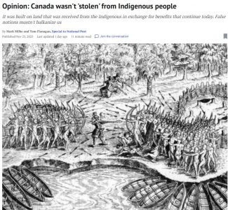 一個更強烈的論點可能是:後來的定居者欠更早的定居者,因為他們“偷走了土地”。然而,這一說法忽略了加拿大各地簽署的無數條約,也忽略了英國殖民體系及約翰·A·麥克唐納的基本方針——即簽約優於赤裸裸的征服。相比之下,歷史上許多帝國(包括如今被稱為原住民的群體)都曾通過武力征服。