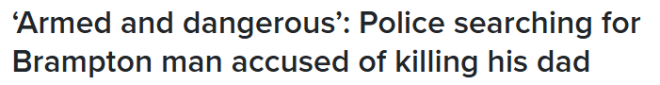 CityNews周日(11月23日)报道,皮尔区警方正在追捕一名布兰普顿(Brampton)男子,他被控在周末与父亲发生争执时将其杀害。