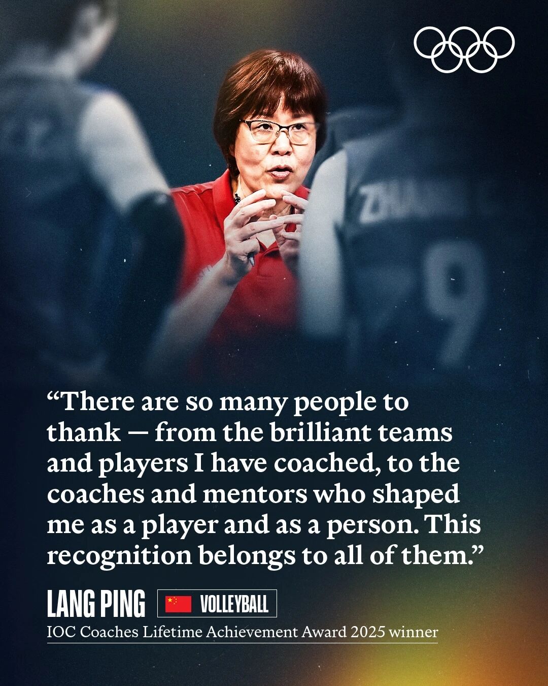 国际排联晒出了郎平执教期间的经典画面,中国排协写道:祝贺郎平指导获得2025年国际奥委会教练终身成就奖!郎平曾于1995年-1998年和2013年-2021年担任中国女排主教练,带领球队获得2015年女排世界杯、2016年里约奥运会和2019年女排世界杯冠军,为中国排球做出了卓越贡献。