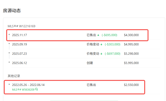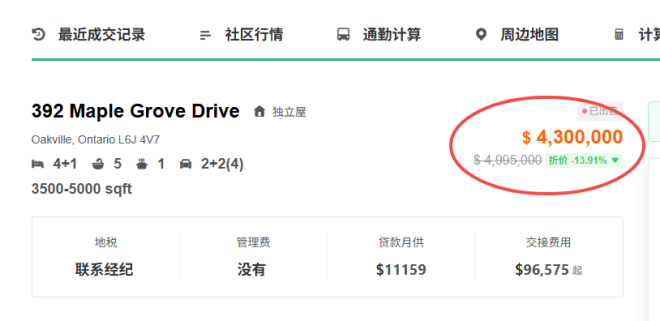 这栋位于奥克维尔东湖社区的新建房产,曾作为慈善机构2025年春季抽奖活动的样板房,标价900万元,但根据其挂牌记录,最近仅以430万元的价格易手。这笔交易于11月17日完成,此前该房产的挂牌价略低于500万元。比最初挂牌价便宜170万。