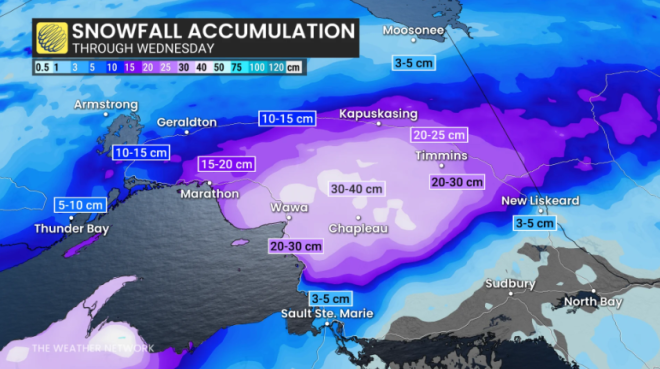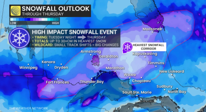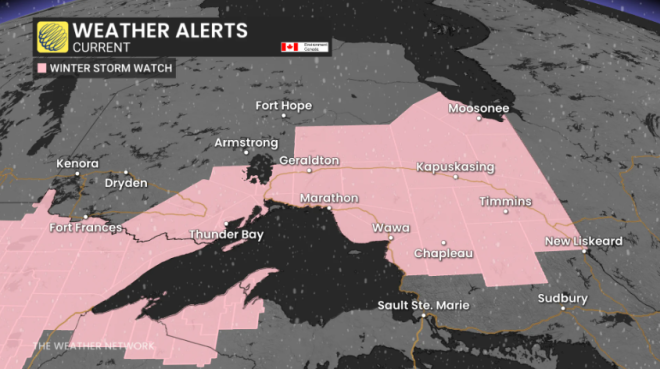 这将是一次覆盖整个北安大略的大型、长时间降雪事件,最强降雪预计会出现在西北安大略主要高速公路沿线以及苏必利尔湖北岸。气象部门已经发布冬季暴雪警告。