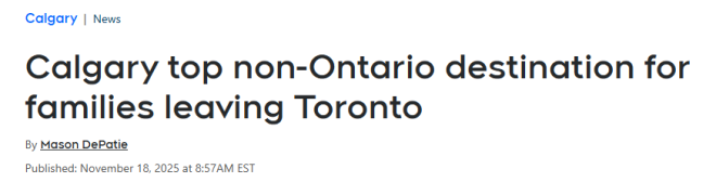 数据显示,从2024年第二季度到2025年第一季度,有超过3.5万个家庭搬出GTA到其他地区。其中有2,131个家庭,也就是约6.1%,选择搬到卡尔加里,使它成为安大略以外最受欢迎的目的地。