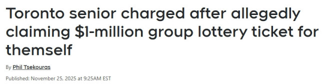 多伦多一名70岁的居民面临多项指控。警方称,此人将一张中奖金额为100万加元的Lotto Max据为己有,未按约定与合买小组的其他成员分享奖金。