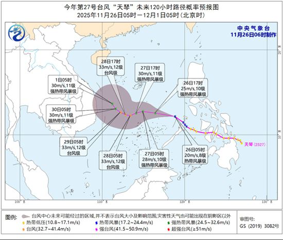 此外,海上还需关注今年第27号台风“天琴”。它已于今天凌晨移入南海,预计,“天琴”将以每小时20至25公里的速度向偏西方向移动,强度逐渐加强,最强可达台风级,29日开始逐渐转向西偏北方向移动,向南海中西部海面靠近,强度缓慢减弱。