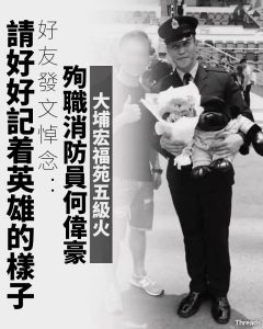 大埔宏福苑五級大火中殉職的消防員何偉豪(37歲),據悉為前警務人員,曾任機場特警,在警隊時綽號「大隻豪」,其後轉職消防員,警隊同袍昨晚在私人社交群組中發文悼念。