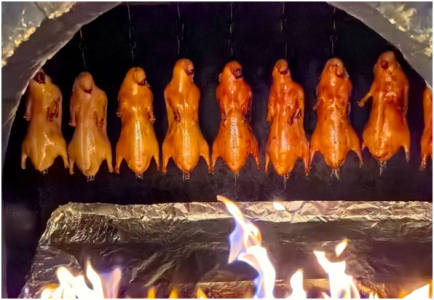 为啥北京烤鸭这么好吃呢?这跟选料、处理、烤制的方法有关。做北京烤鸭选的是“填鸭”。养殖者用管道把大量食物直接塞入鸭子食道,让它们快速增肥,脂肪渗透到皮下,这样的鸭子烤出来才有嫩而不腻的口感。杀好的鸭子需要在脖子处打气,可以使鸭皮和鸭肉分离,这样烤制的鸭子鸭皮能更鼓更脆。