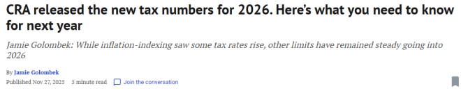 2026年,CRA使用的通胀指数是2%(去年是2.7%)。这意味着,绝大多数与个人税务和福利相关的金额都会小幅上调。
