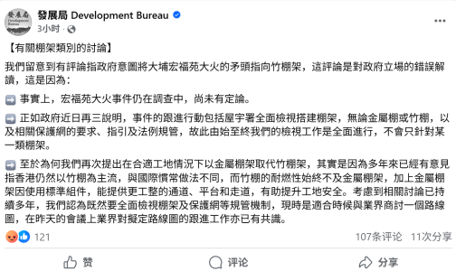28日,香港發展局發表聲明稱,留意到有評論指特區政府意圖將大埔宏福苑大火的矛頭指向竹棚架,這是對政府立場的錯誤解讀。