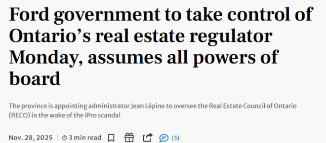 负责RECO的公共与商业服务交付及采购厅厅长克劳福德(Stephen Crawford)在致RECO董事会主席Katie Steinfeld和CEO Brenda Buchanan的信中写道:“为防止对公众和消费者利益造成严重伤害,我已决定有必要任命一名行政监管人全面接管RECO,包括董事会、管理层及成员的所有权力与职责。”