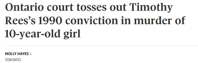 在Timothy Rees因谋杀一名10岁女孩被定罪35年后,安省上诉法院宣布撤销其定罪,并裁定本案发生了司法不公。