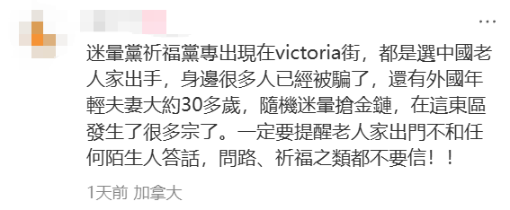 网友B附和:该区域实际已出现“迷晕”与“祈福”手法混合实施的骗局。身边已经有不少老人被骗了,有的被迷晕后带回家拿钱,有的则是在“祈福”的过程中,被人顺手抢走金链子。