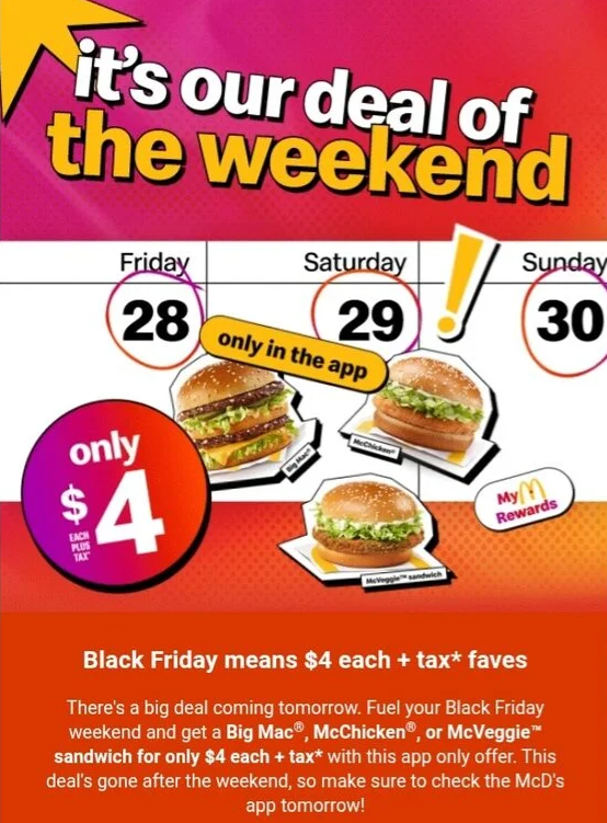 麦当劳送汉堡:麦当劳APP也有黑五活动,Big Mac,McChicken,McVeggie三款汉堡只要$4,限时3天(本周末),仅限APP下单。