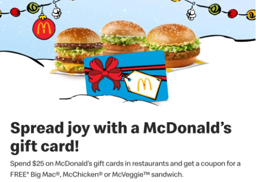 此外,最近购买$25麦当劳礼品卡,免费送一张汉堡券,可兑换巨无霸、麦香鸡、素汉堡三款任选其一(兑换期2026年1月1日-2月28日)。