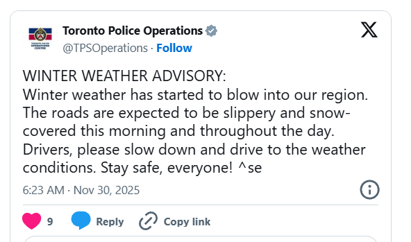 多伦多警方表示,结冰路面今早已导致几起碰撞事故,并呼吁司机减速并在出门前做好准备。