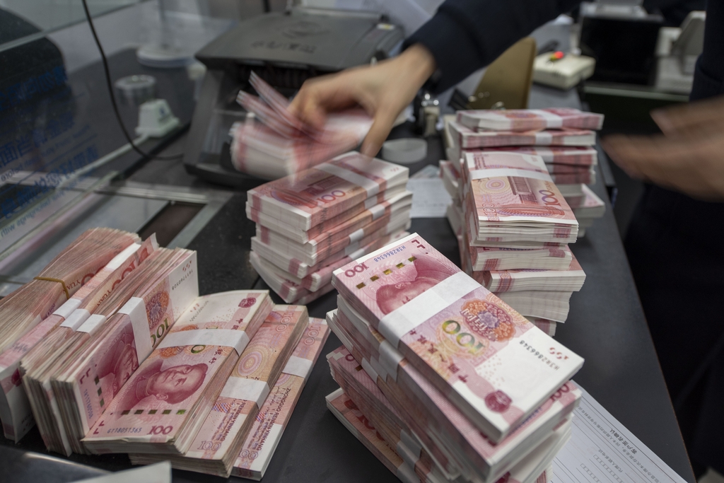 2021年2月1日,在江苏南通一家银行,银行人员在清点客户存入的人民币现钞。 IC Photo