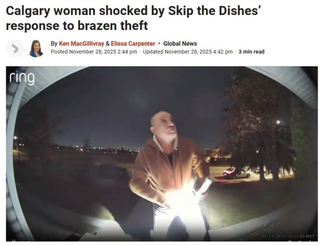 卡格里女子震驚:Skip the Dishes 外賣員明目張胆偷包裹,公司回應讓人更“離譜”!