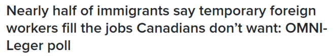 北美市场研究公司Leger为OMNI News做的一项最新民调显示:36%的移民认为临时外劳抢走了年轻人的工作,但47%认为这个计划填补了很多加拿大人不愿做的工作。