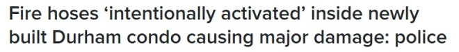 多伦多Durham区一栋新建成的楼遭遇严重水损,警方表示这是因为有人“故意启动”了大楼内的紧急消防水阀。