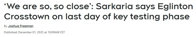 安省厅长确认,Eglinton Crosstown正在完成为期30天的最终测试,今天就是最后一天。接下来将进入最终收尾阶段,有望正式开放乘客使用。