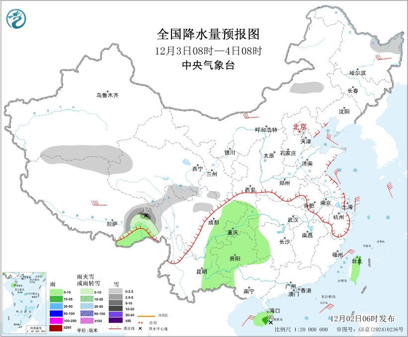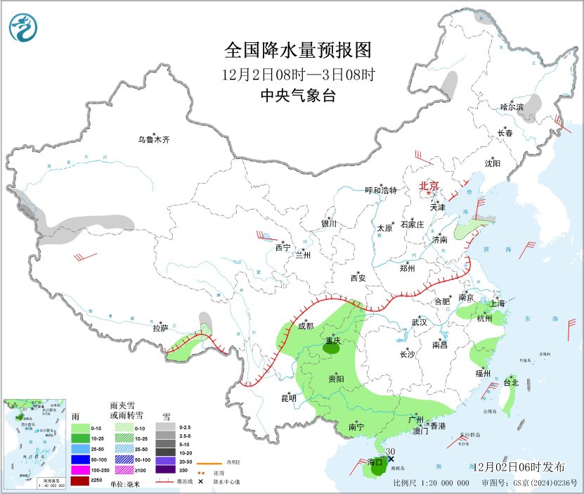 12月2日08时至3日08时,黑龙江西北部和南部、新疆南疆盆地、西藏东北部和东南部、山东半岛、辽东半岛等地部分地区有小雪或雨夹雪,其中,新疆南疆盆地等地部分地区有中雪。浙江北部、福建东北部、西南地区东部、华南大部、海南岛等地部分地区有小到中雨,其中,海南岛东北部等地部分地区有大雨(25~30毫米)。内蒙古中部、西藏中北部、青海东部、山东半岛、辽东半岛等地部分地区有5~6级风。渤海、渤海海峡、黄海大部海域、东海大部海域、台湾海峡、台湾以东洋面偏北海域、巴士海峡偏北海域、南海北部海域将有7~8级、阵风9~10级的大风。