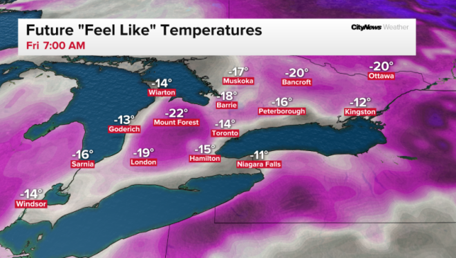 周五清晨,多伦多体感温度为零下14度,Barrie周边地区为零下18度。