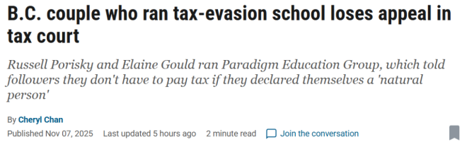 根据加拿大税务部(CRA)的资料,Balogh从2005年开始照搬“范式教育集团”的那一套,坚信只要自称是“自然人”,就不用交税。