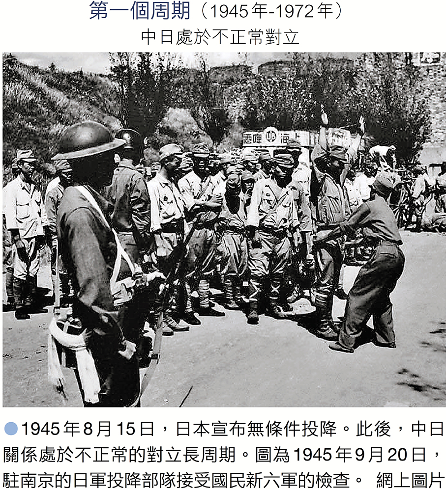 劉江永指出,第一個周期是1945年—1972年,中日關係處於不正常的對立長周期。吉田茂、岸信介、佐藤榮作等親美政府主導這一時期的日本對華政策。他們推行「一中一台」「兩個中國」,導致中日邦交正常化遲遲難以實現。
