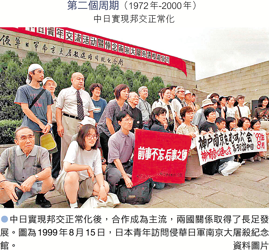 第二個周期是1972年—2000年,這段時間中日實現邦交正常化,締結和平友好條約,雖有矛盾,但合作是主流,關係取得了長足發展。關鍵是當時日本領導人和決策層決定與台灣當局斷交,在歷史問題上承認侵略歷史並作出反省,結構性矛盾要麼得到解決,要麼相對緩解,中日關係得以順利發展。