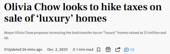 市长邹至蕙(Olivia Chow)正要求市议会提高高价房屋的交易税,她表示此举将有助于让城市变得更负担得起。