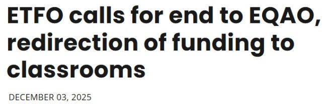 针对最新的EQAO成绩,安省小学教师联合会(ETFO)重申,应该终止这一昂贵的测试项目,并将数EQAO的经费重新投入课堂,用于减小班级规模、加强真正有助于学生学习和身心健康的支持。